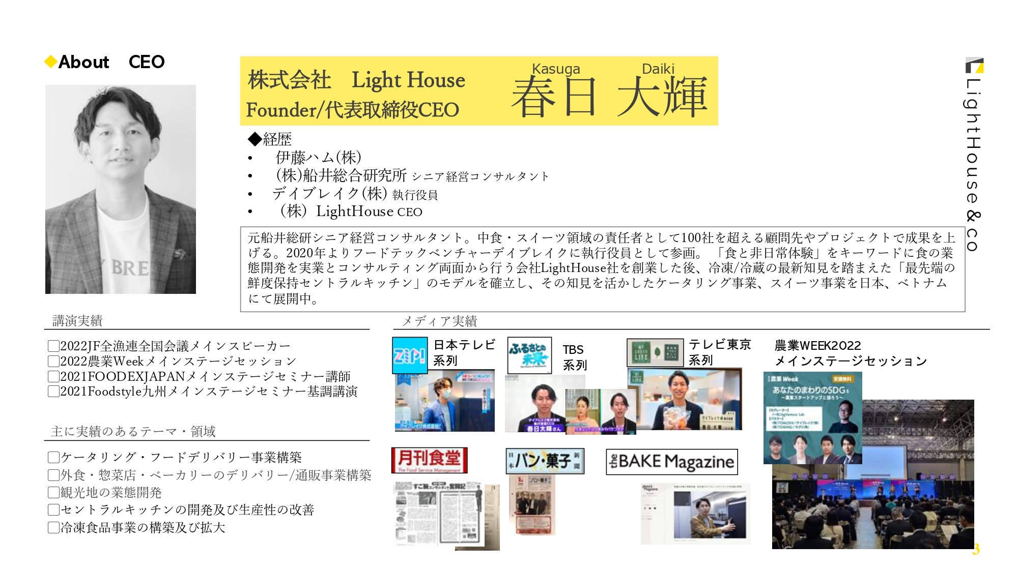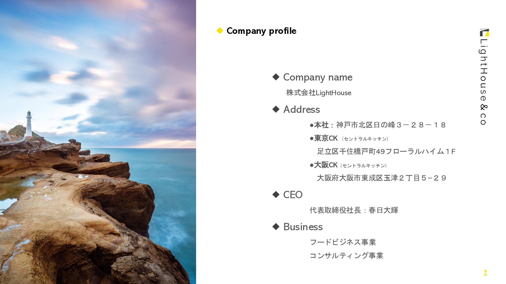 | オフィス | ・本社:神戸市北区日の峰3−28−18 ・東京セントラルキッチン: 足立区千住橋戸町49-1F ・大阪セントラルキッチン: 大阪市東成区玉津2丁目5−29 |