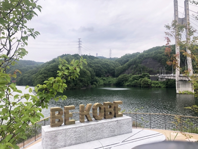 自然豊かな神戸市北区衝原湖湖畔のつくはら大橋休憩所の風景