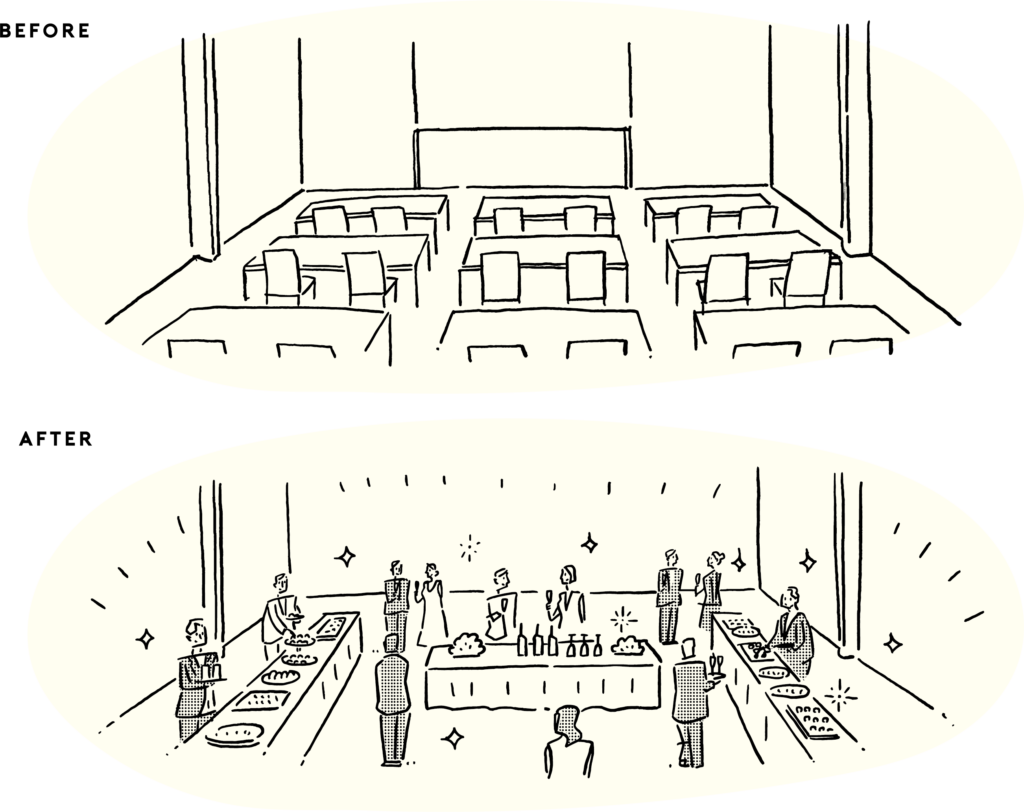 イベント演出:ビュッフェスタイルやコース料理など、お客様に合わせたスタイルで料理を提供します。特別な演出をご希望のお客さまは是非事前打ち合わせの際にご相談ください!