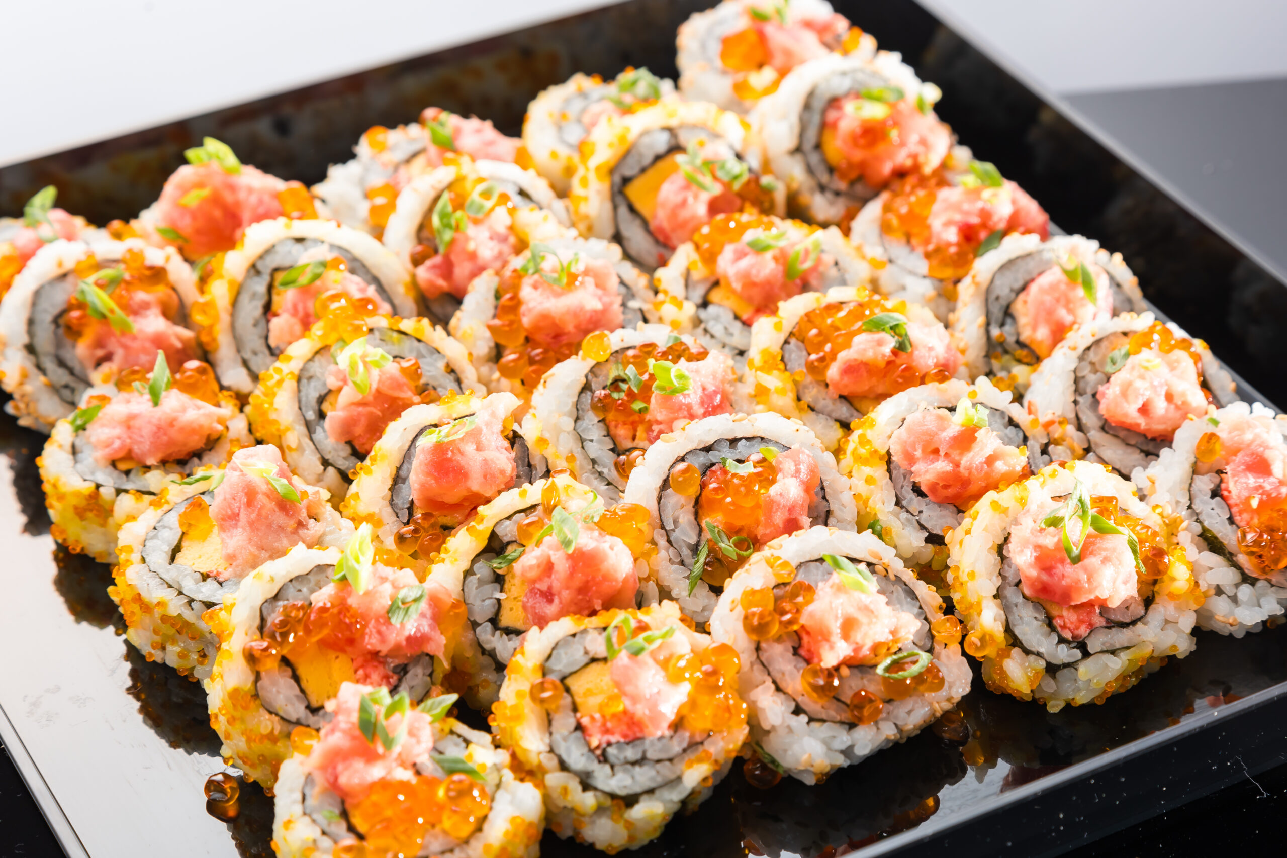 巻き寿司の上にマグロとイクラをのせた、みんなが喜ぶ巻き寿司です。
